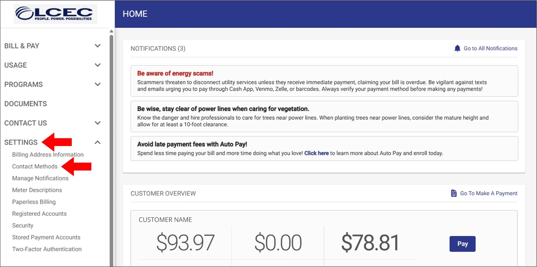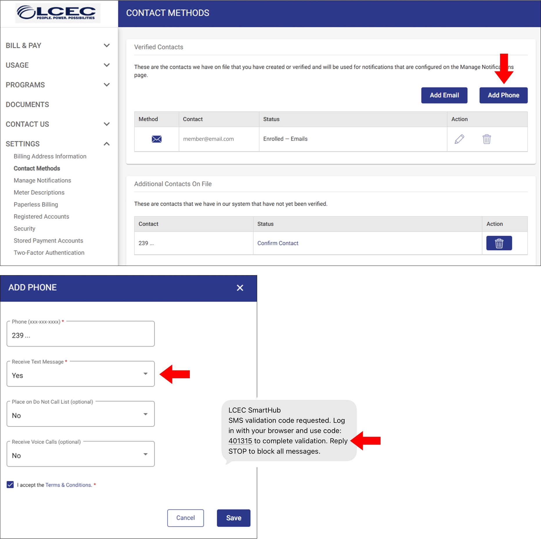 To register your number within SmartHub via the web, log into your LCEC SmartHub account. If not registered refer to Setting up an account.