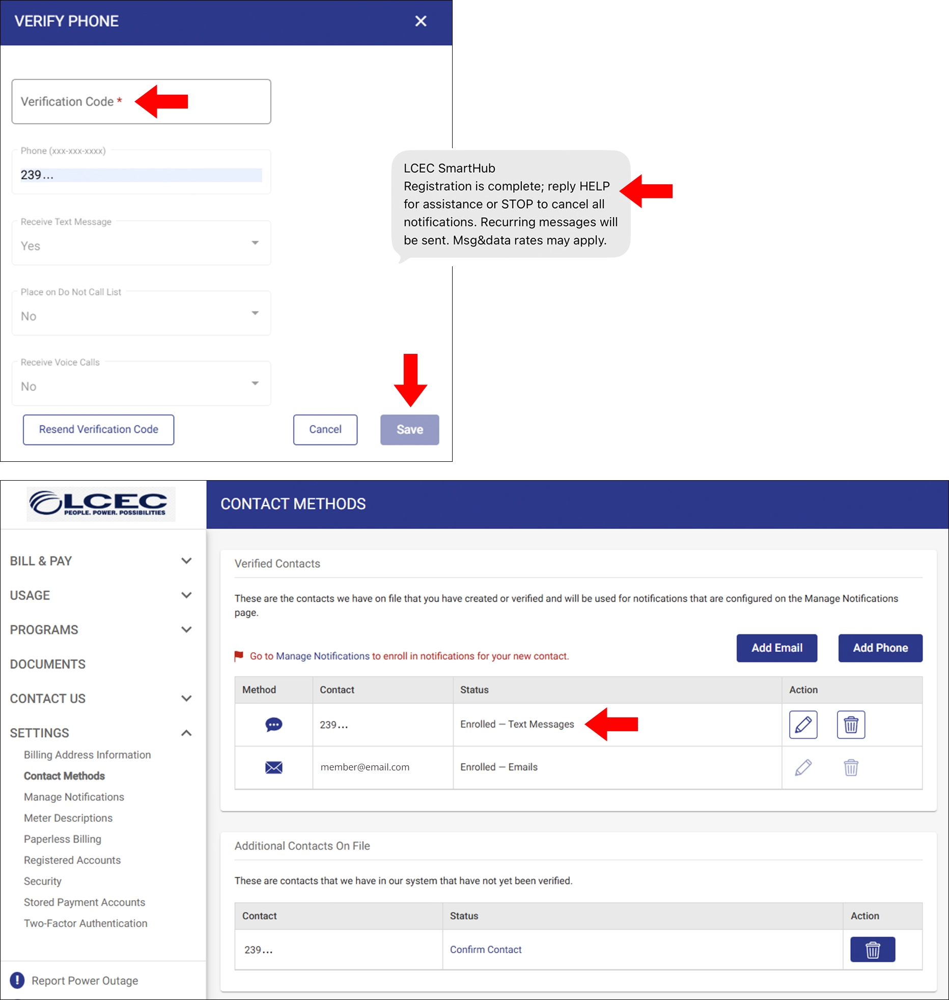 3. You will enter the text code in the indicated “Verification Code” box and click “Save.”