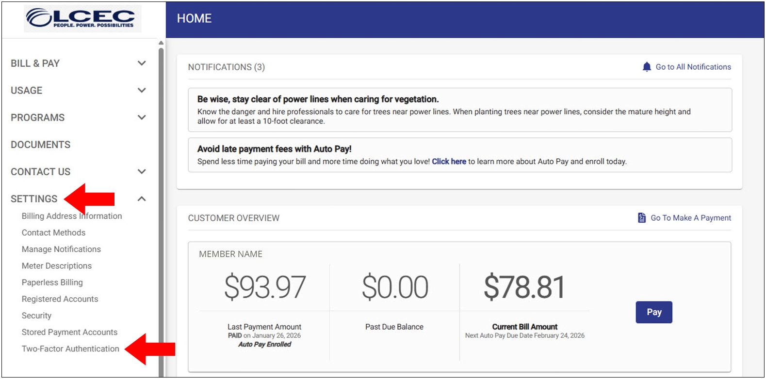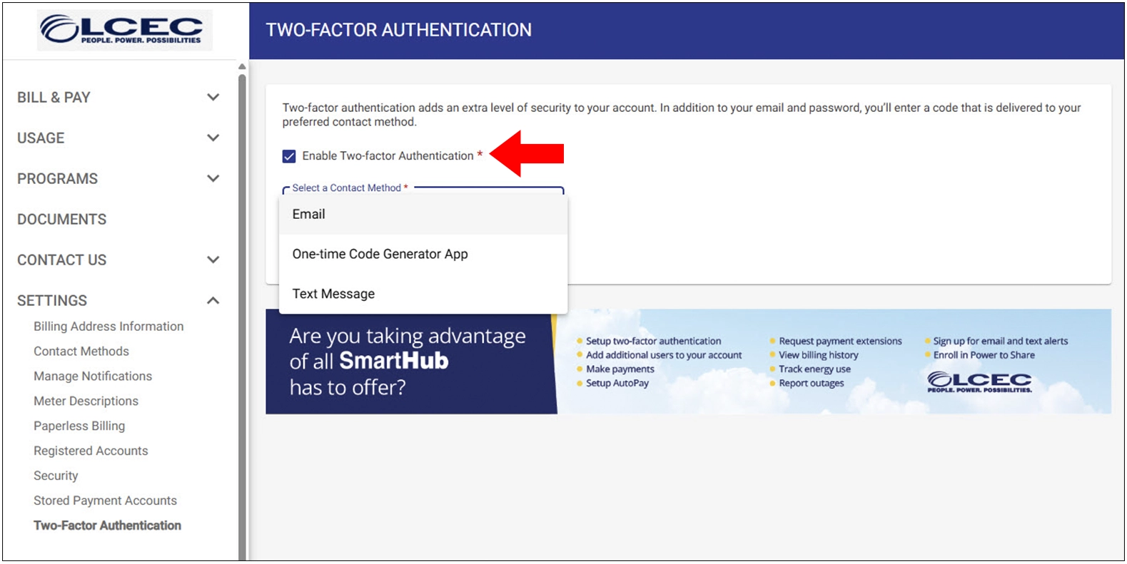 To set up two-factor authentication for your SmartHub account, follow these easy steps. If not registered to SmartHub refer to Setting up an account.